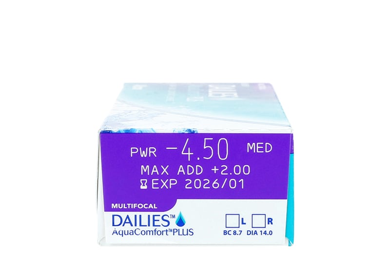 Dailies AquaComfort Plus Multifocal 30 Pack contact lenses provide clear, comfortable vision at all distances for individuals with presbyopia. Featuring advanced moisture technology, these daily disposable lenses ensure lasting hydration and comfort throughout the day. With smooth transitions between near, intermediate, and distance vision, Dailies AquaComfort Plus Multifocal lenses deliver sharp, crisp vision, making them the ideal choice for active individuals seeking convenient, all-day comfort and clarity.