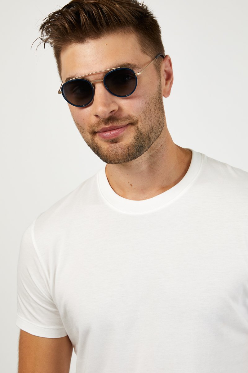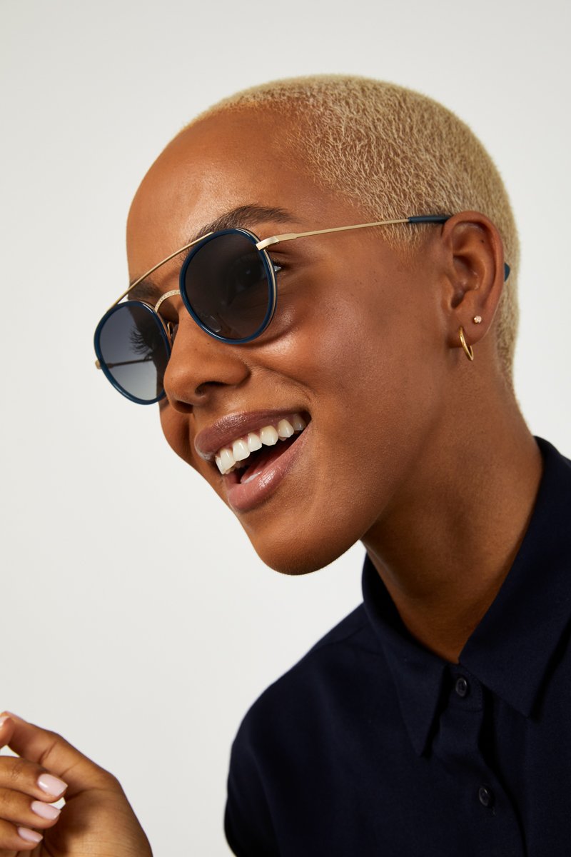 Designed in Stockholm and made in Italy, Twin is a fresh take on a classic metal eyeglass frame. The round lenses are held in with a combination of acetate and metal, and the nose-bridge features a unique pattern.