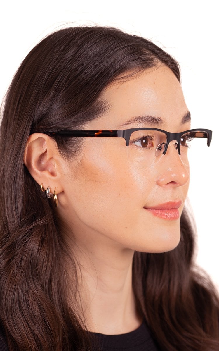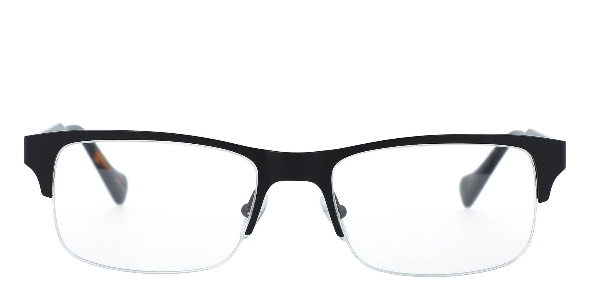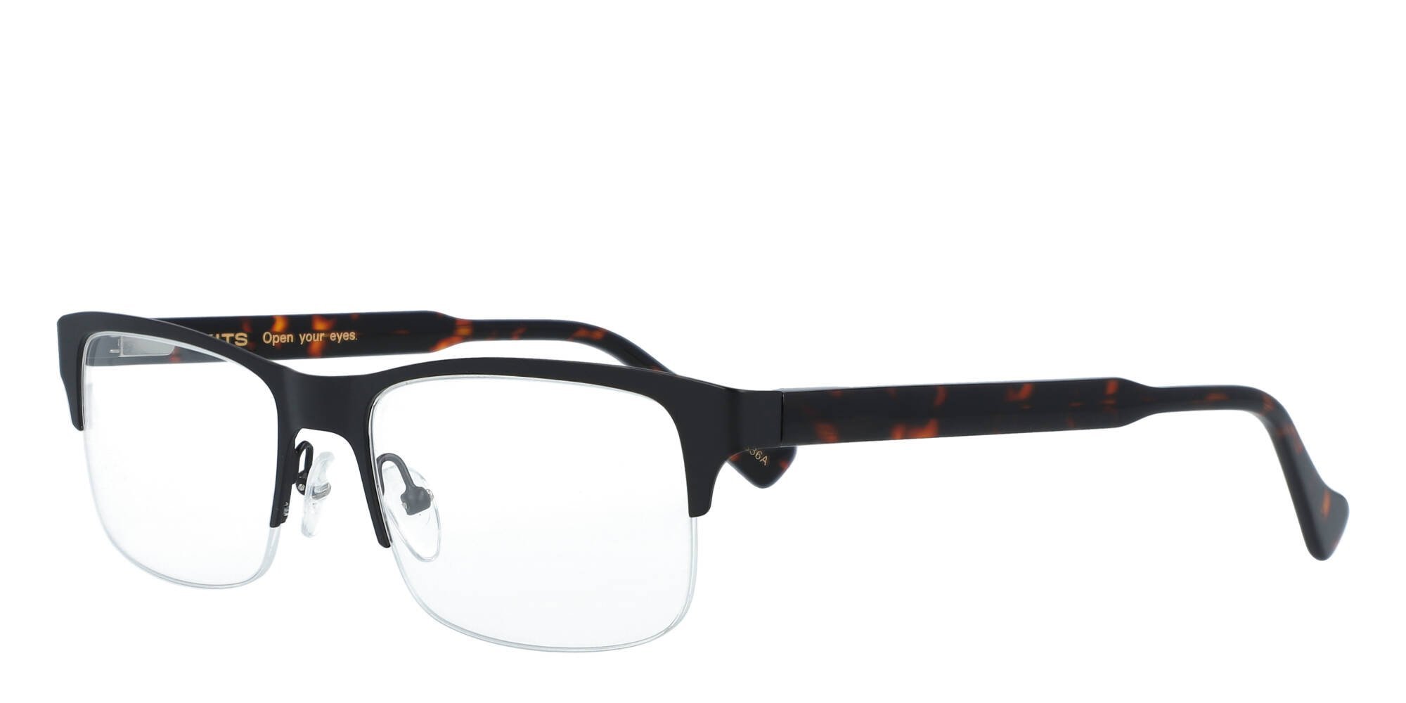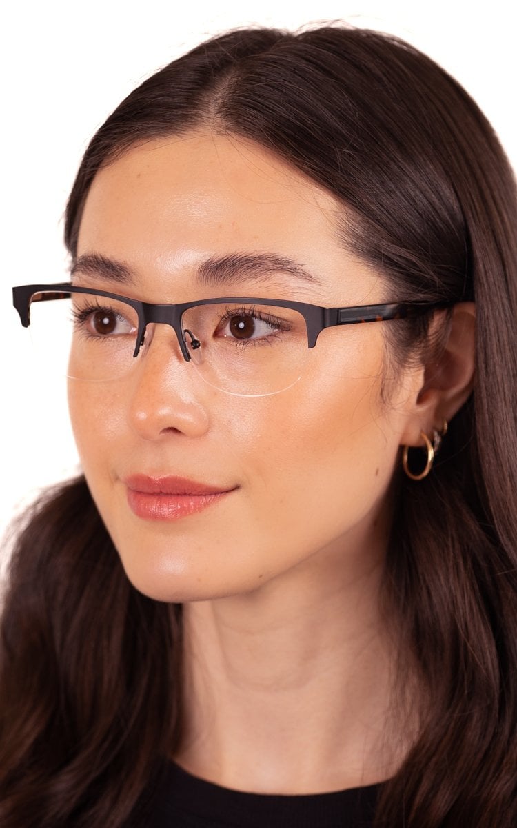 The Hector eyeglass design offers a bold take on the classic semi-rimless frame. A satin gunmetal front is paired with black acetate temples for a strong look. Adjustable nose pads provide ultimate comfort. Please note these frames fit large and are best suited to those with wider faces.
