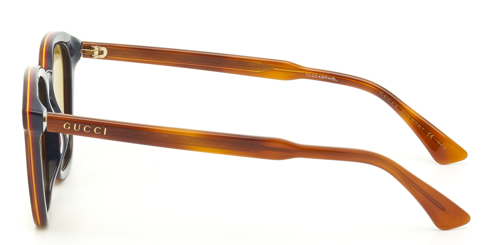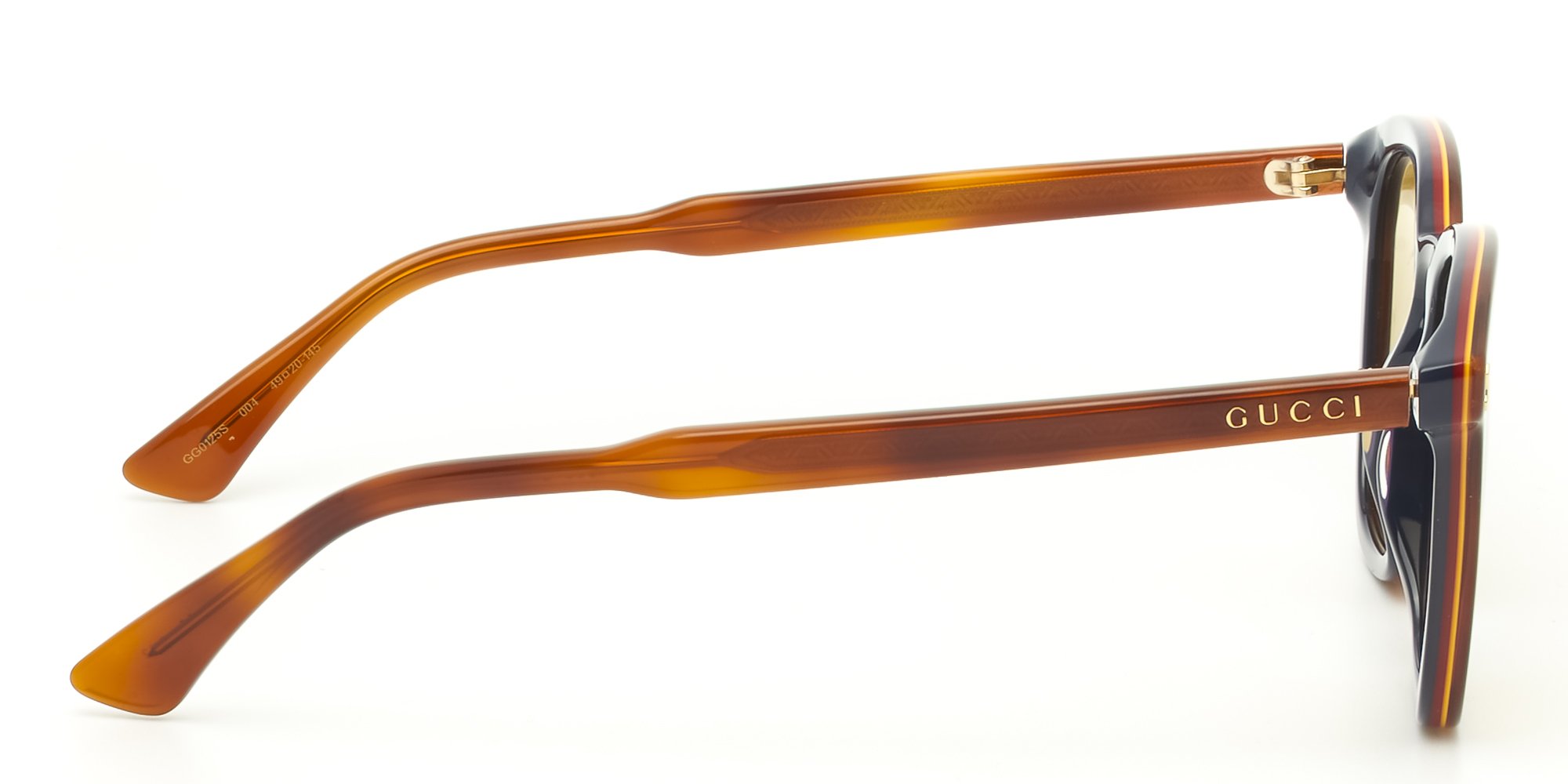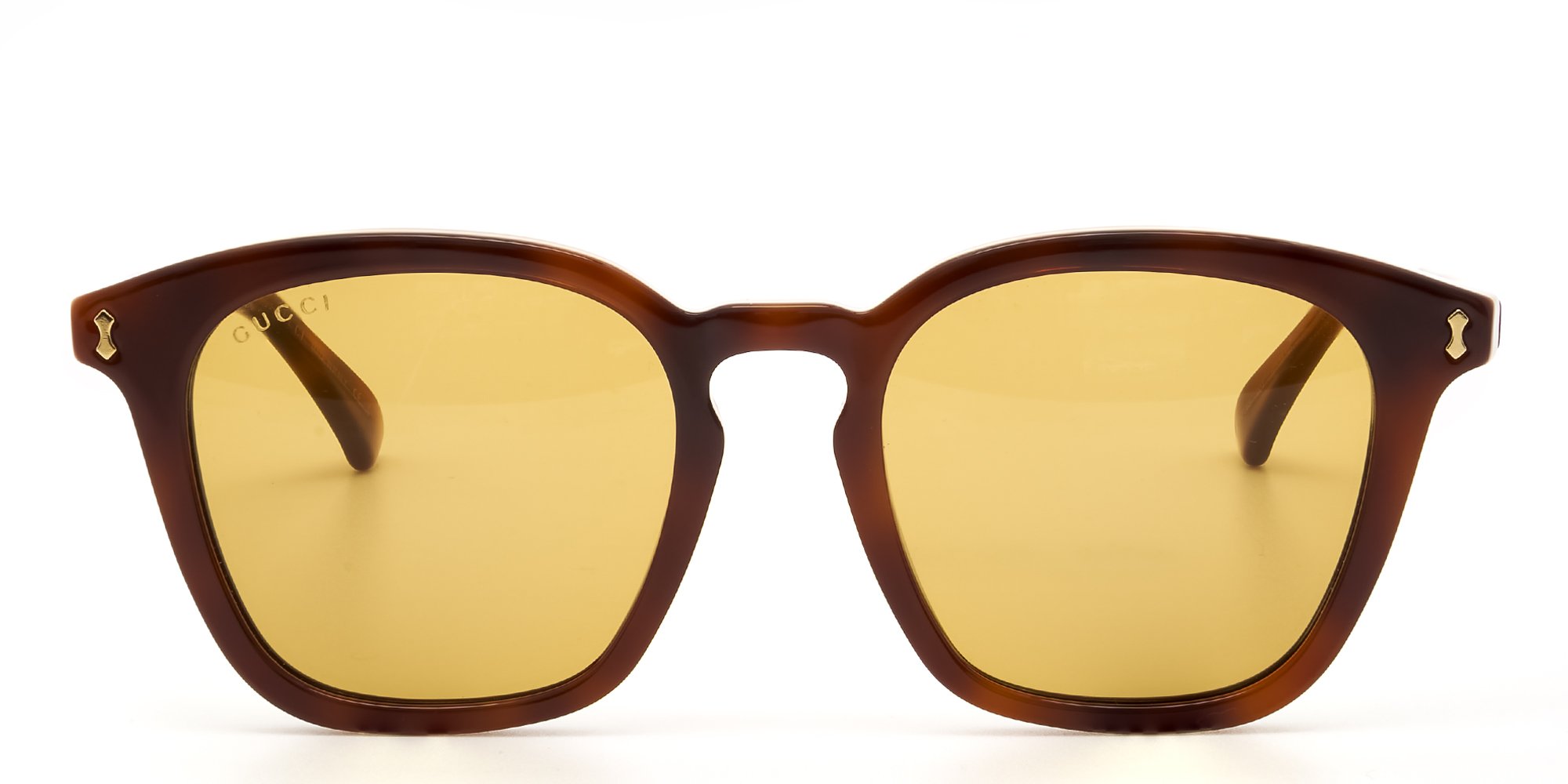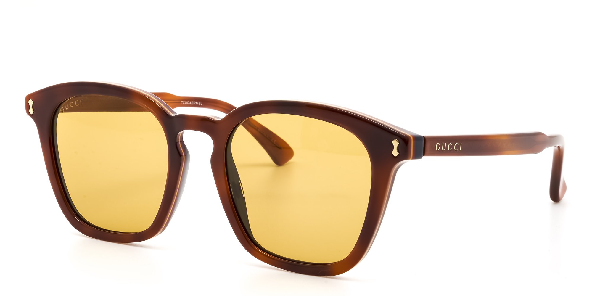The uniquely square shape of these Gucci GG0125S frames is perfectly accented by yellow tinted lenses and a classic amber Havana acetate. A keyhole bridge lends a vintage look to this timeless style. Unique metal rivets completw the look.
