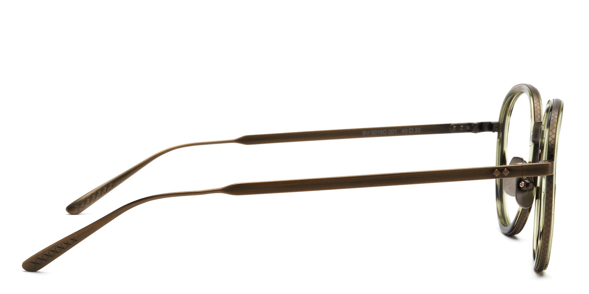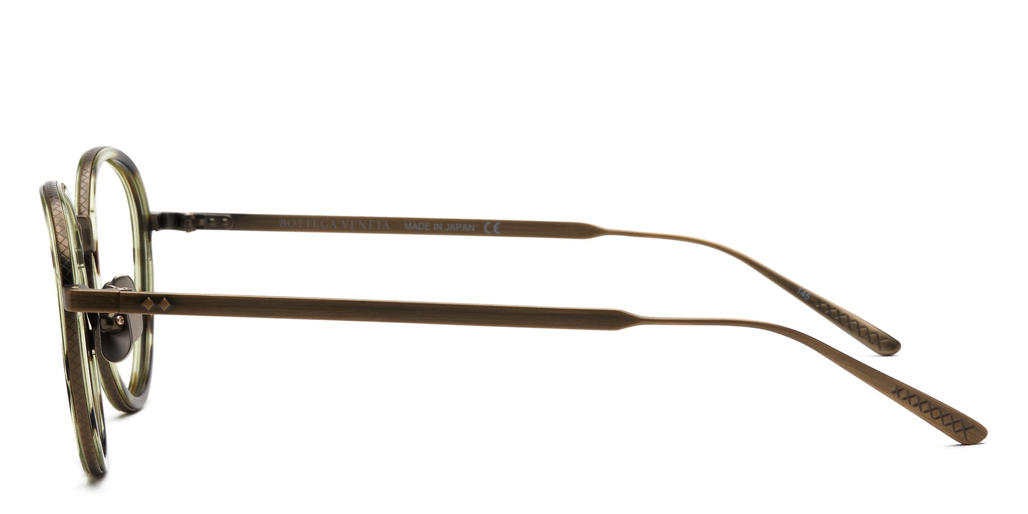 The BV0018O eyeglasses by Bottega Veneta are a playful, modern reimagining of a truly classic style. With their round profile, these glasses exude a vintage vibe, but the rims and temples are all contemporary fun. The rims are a combination of acetate encased in metal making the eyeglasses both strong and lightweight. A small double diamond logo adorns the temple ends, a subtle nod to your emphasis on chic style.