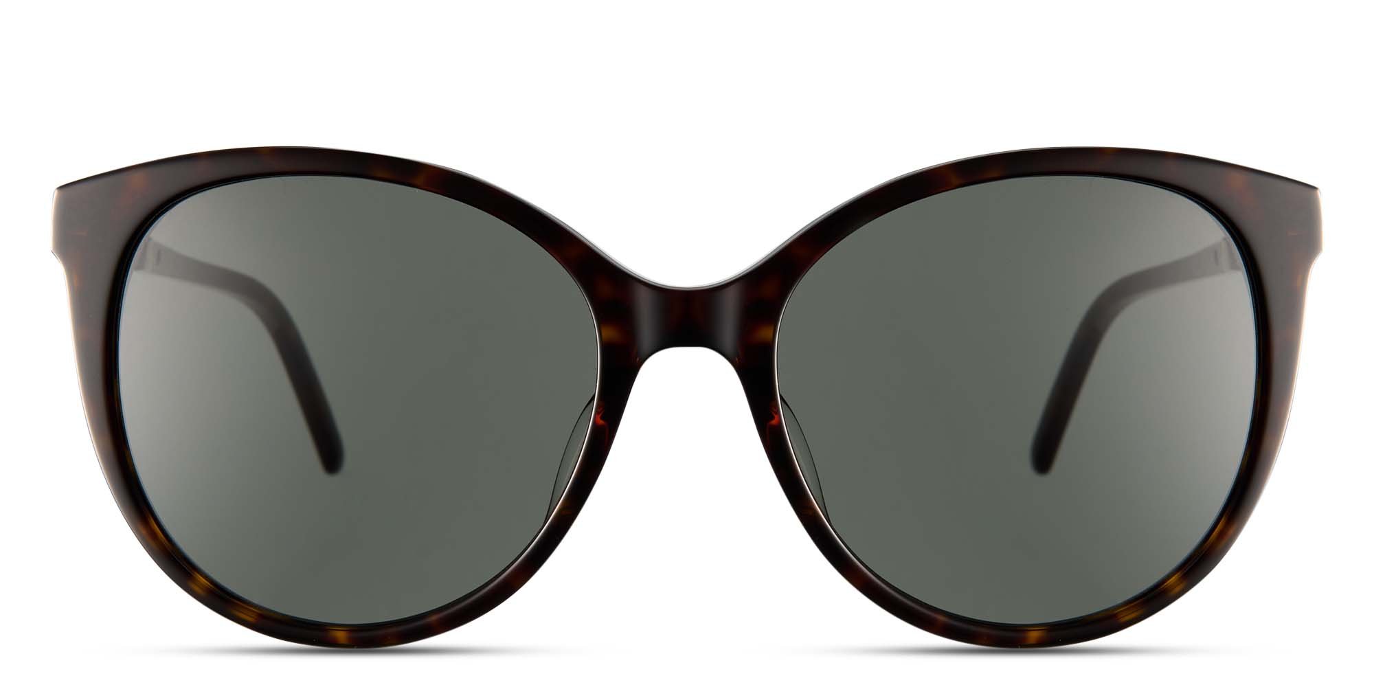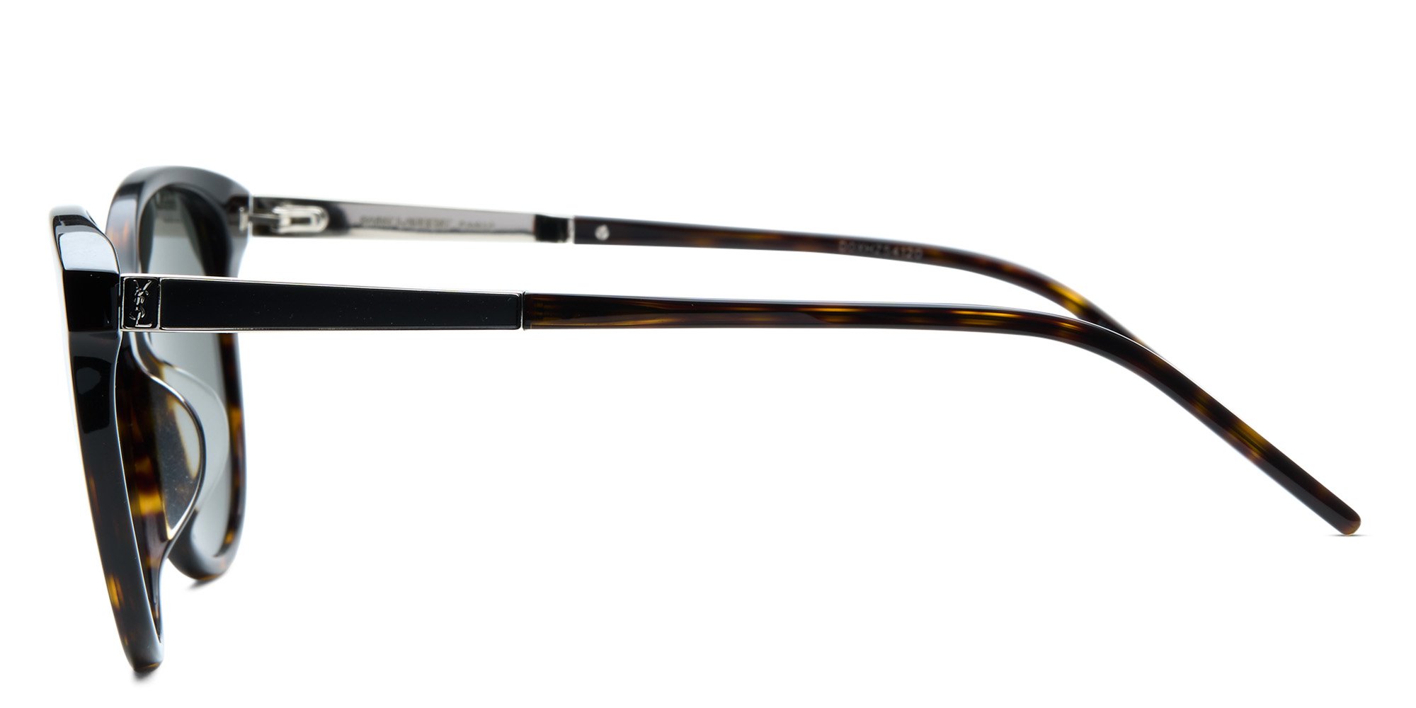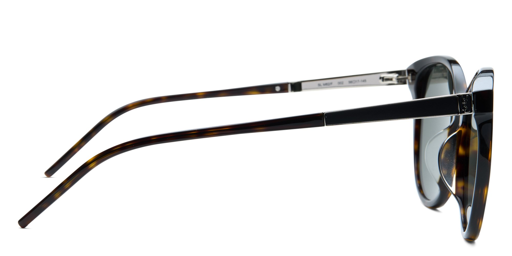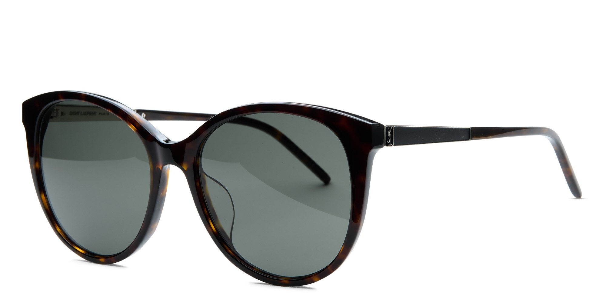 Express your inner glamour wearing the SL M82F sunglasses by Saint Laurent. The frames showcase a dramatic cat eye shape and graceful lines that uplift your everyday style. These sophisticated full rim sunglasses are finely crafted of acetate, a durable and lightweight material with a beautiful glossy finish. Metallic accents sweep from the brow ends to add a striking contrast. Experience the uncompromising design and construction of these chic Saint Laurent SL M82F sunglasses.