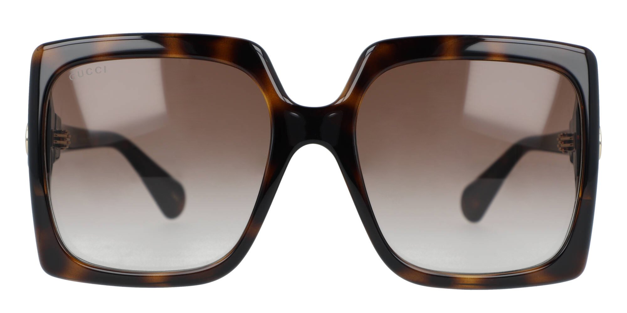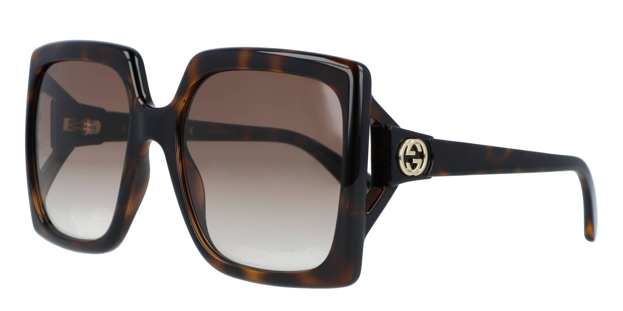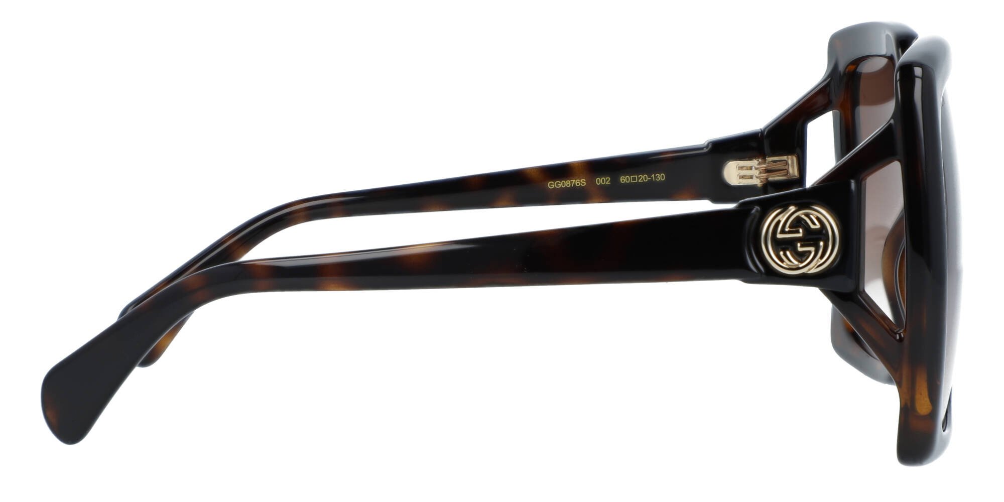 Think outside the box when you choose Gucci GG0876S sunglasses. These thick, square rimmed frames make an eye catching fashion accessory. Gucci crafts the chunky frames in acetate, a versatile and lightweight plastic thats comfortable to wear, with slightly bent temple tips to secure the fit. Low set temples and a thick saddle bridge add a distinctive look and showcase the familiar interlocking G logo. Make a bold statement wearing the GG0876S, a modern take on a retro sunglasses style.