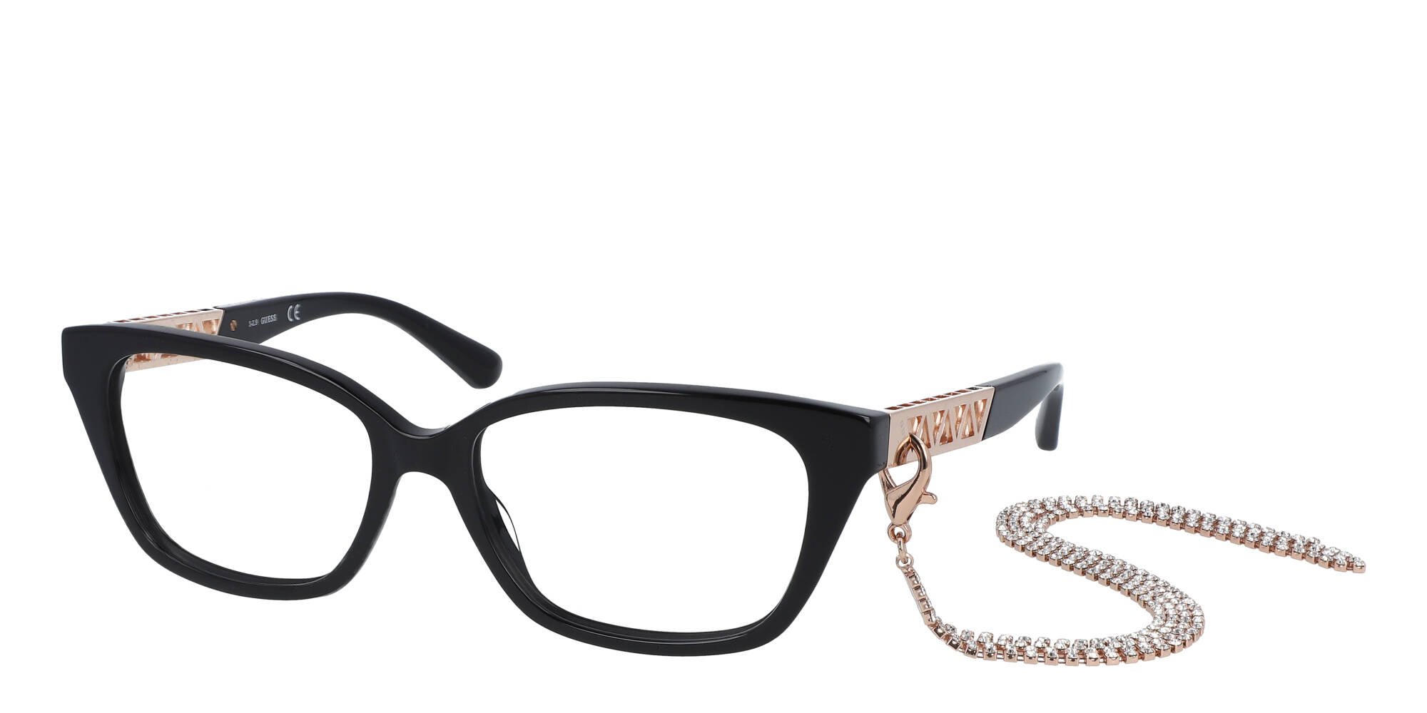Take your everyday wardrobe to the next level wearing the GUESS GU2784 eyeglasses. These are no ordinary rectangles: The softly arched browline and pronounced, squared off endpoints add dimension to the classic style. The GUESS logo and repeating openwork pattern of signature triangular icons at the temples impart designer . The GU2784 glasses from GUESS boast a lightweight metal and performance acetate construction for comfort and durability.