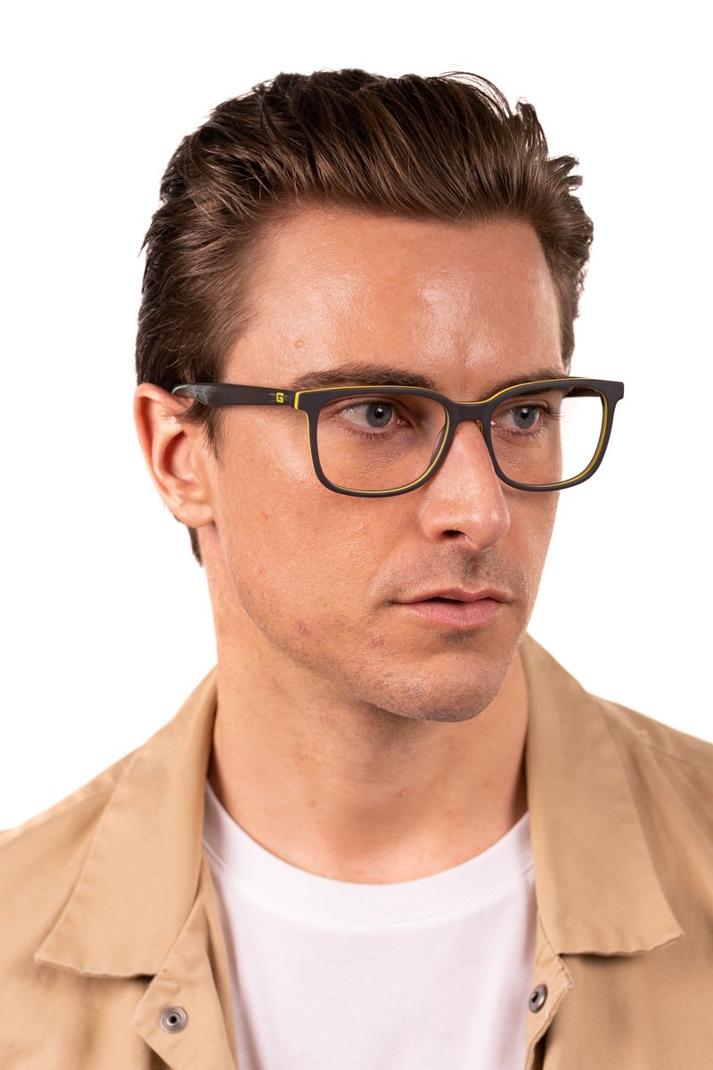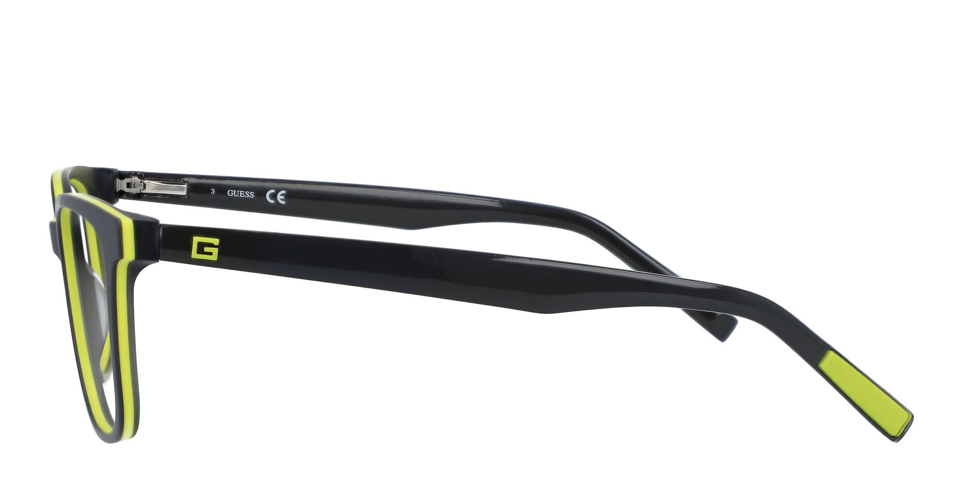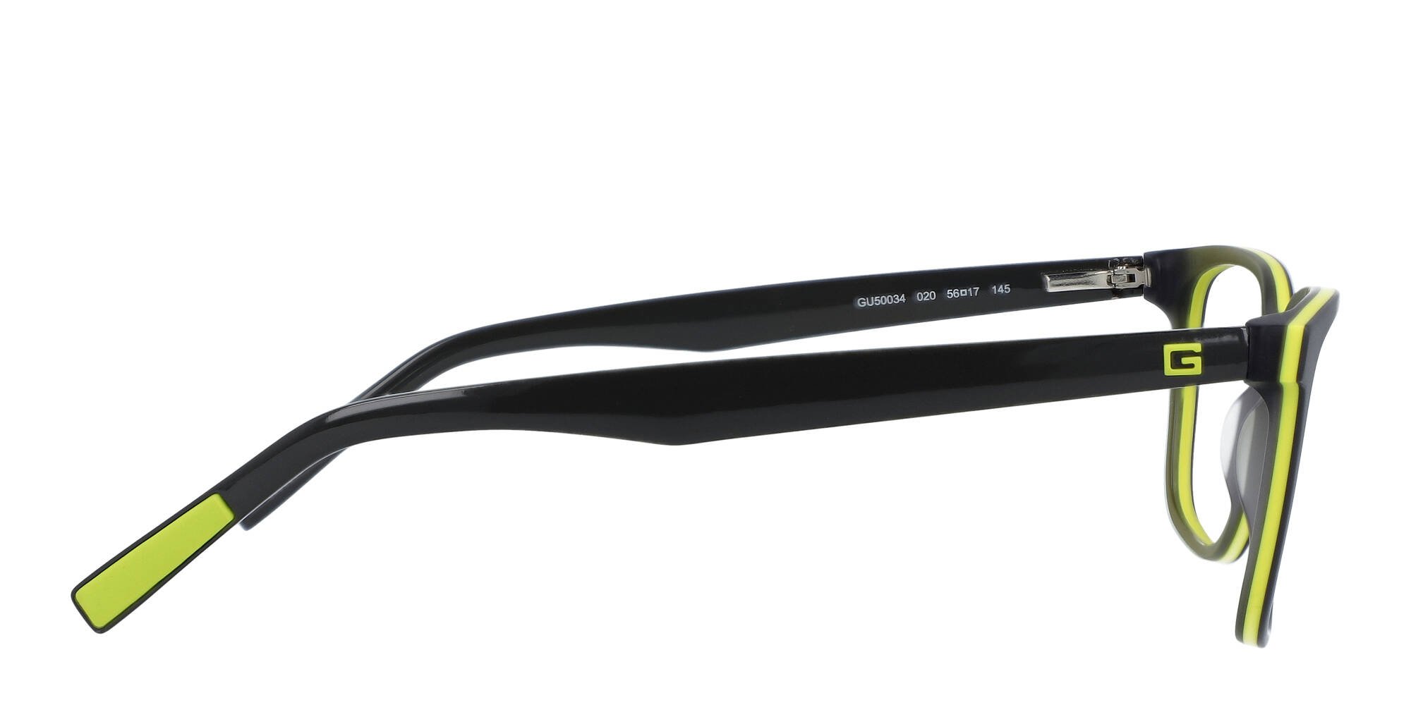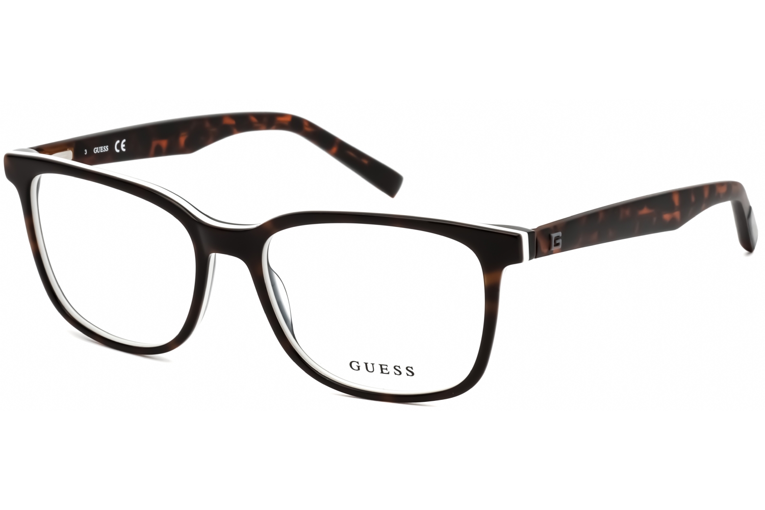GUESS knows that fashion is important, and thats why modern style is built into these GU50034 eyeglasses. The full rim frames are strong and lightweight, and they feature a single saddle bridge for added stability. The flexible spring hinges are comfortable and secure. Shark fin temples boast the GUESS G logo for added appeal. Whether your tastes are vintage or classic, you'll shine with sophistication when you step out wearing these retro styled glasses by GUESS.
