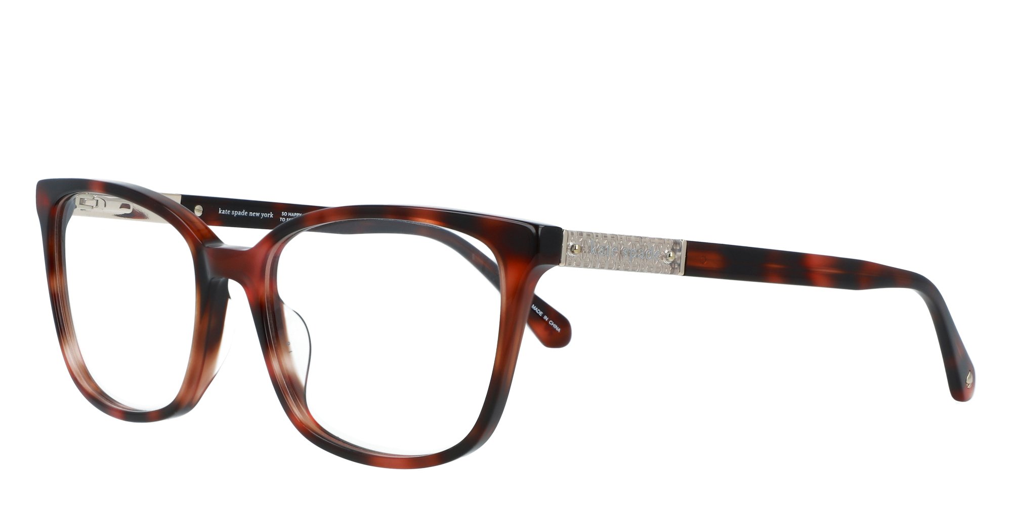 The DAVINA eyeglasses will enrich every women's wardrobe as few accessories can. The acetate structure holds a detail that wont go unnoticed: the brands signature floral inspired filigree band to trim the temples, accented by engraved Kate Spade lettering. As a final original touch, a secret inscription reading SO HAPPY TO SEE YOU is hidden on the inner temples, and the Spade symbol decorates the end tips.