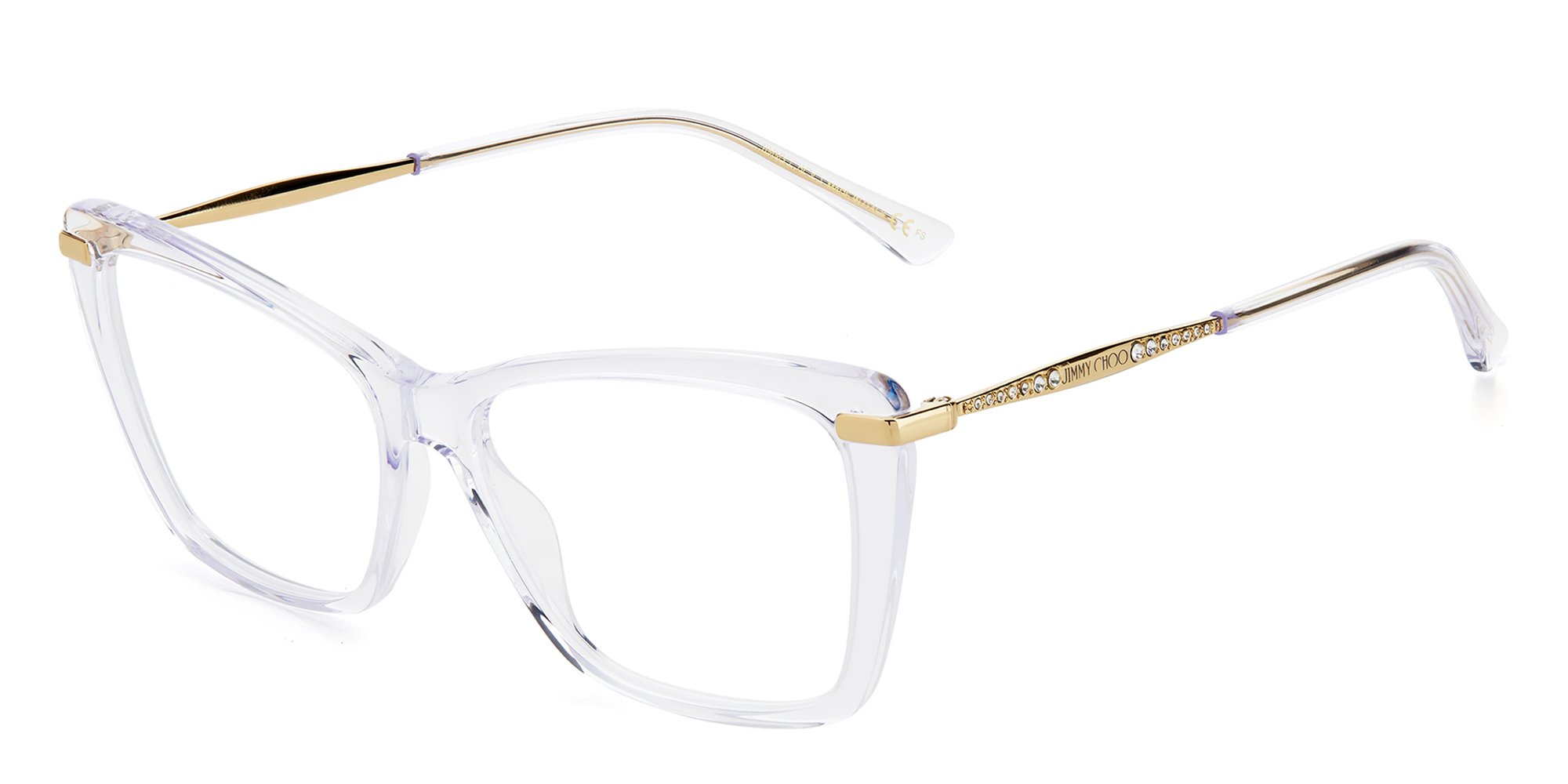 Jimmy Choo's signature playful and luxurious spirit is captured into a selection of eye catching frames with the Light & Crystal eyewear collection. Lightweight metal temples are combined with hand applied glittery fabric and precious Swarovski® crystals for a timeless JC statement.