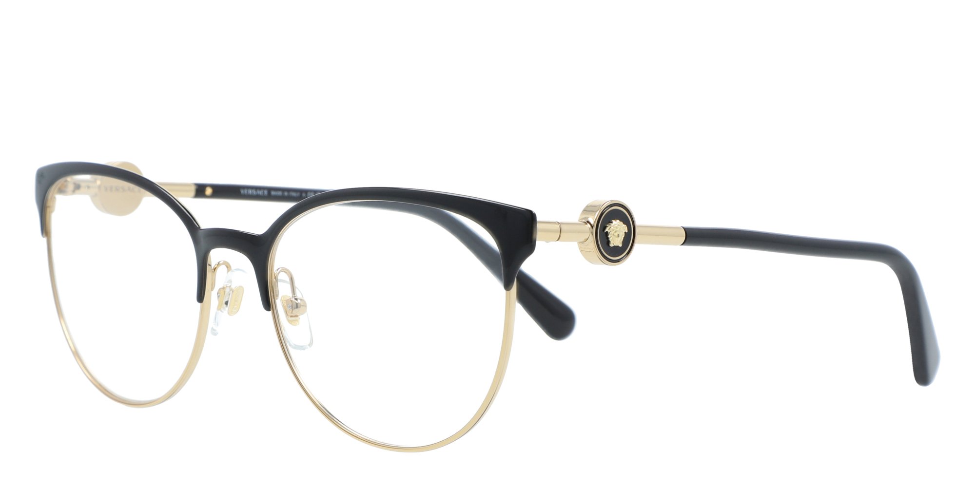 Add a bit of drama to your look wearing the Versace VE1271 eyeglasses. These cat eye frames feature a pronounced browline and lifted, squared off endpoints for a glamorous, statement making look. The signature Versace medusa head appears prominently in medallions at the temples for bold designer appeal. The corrosion resistant metal construction is lightweight and comfortable, and the temples come with acetate coated tips that adjust easily for a secure fit behind the ears. Step out and stand out in the VE1271 glasses from Versace.