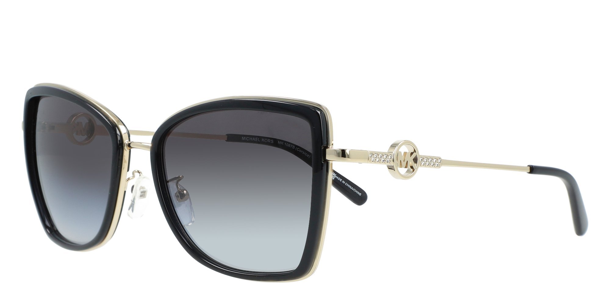 Michael Kors combines modern design with timeless cat eye style in these MK1067B sunglasses for women. The oversized frames are made in lightweight, corrosion resistant metal that retains its shape for lasting beauty. The skull temples curve inward to keep the glasses from slipping during your active lifestyle. A metallic band at the rim adds chic appeal to these cool shades from Michael Kors.