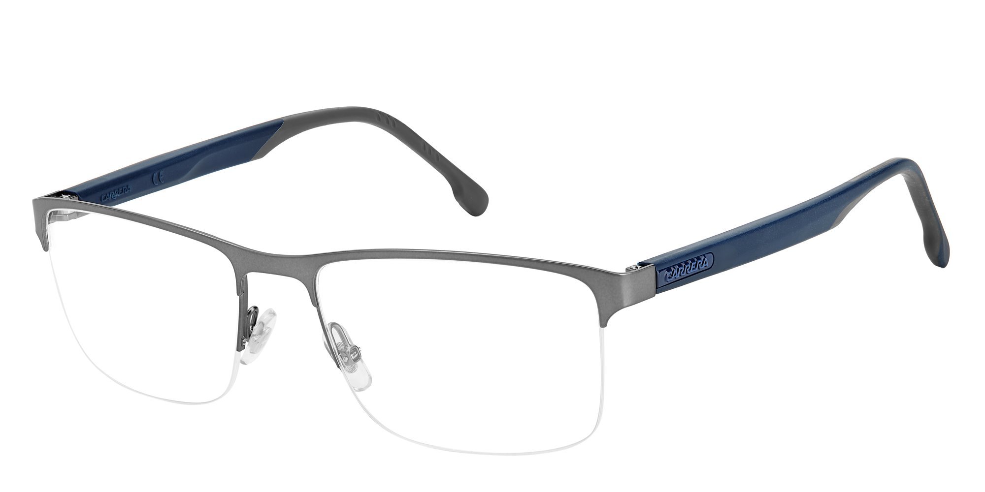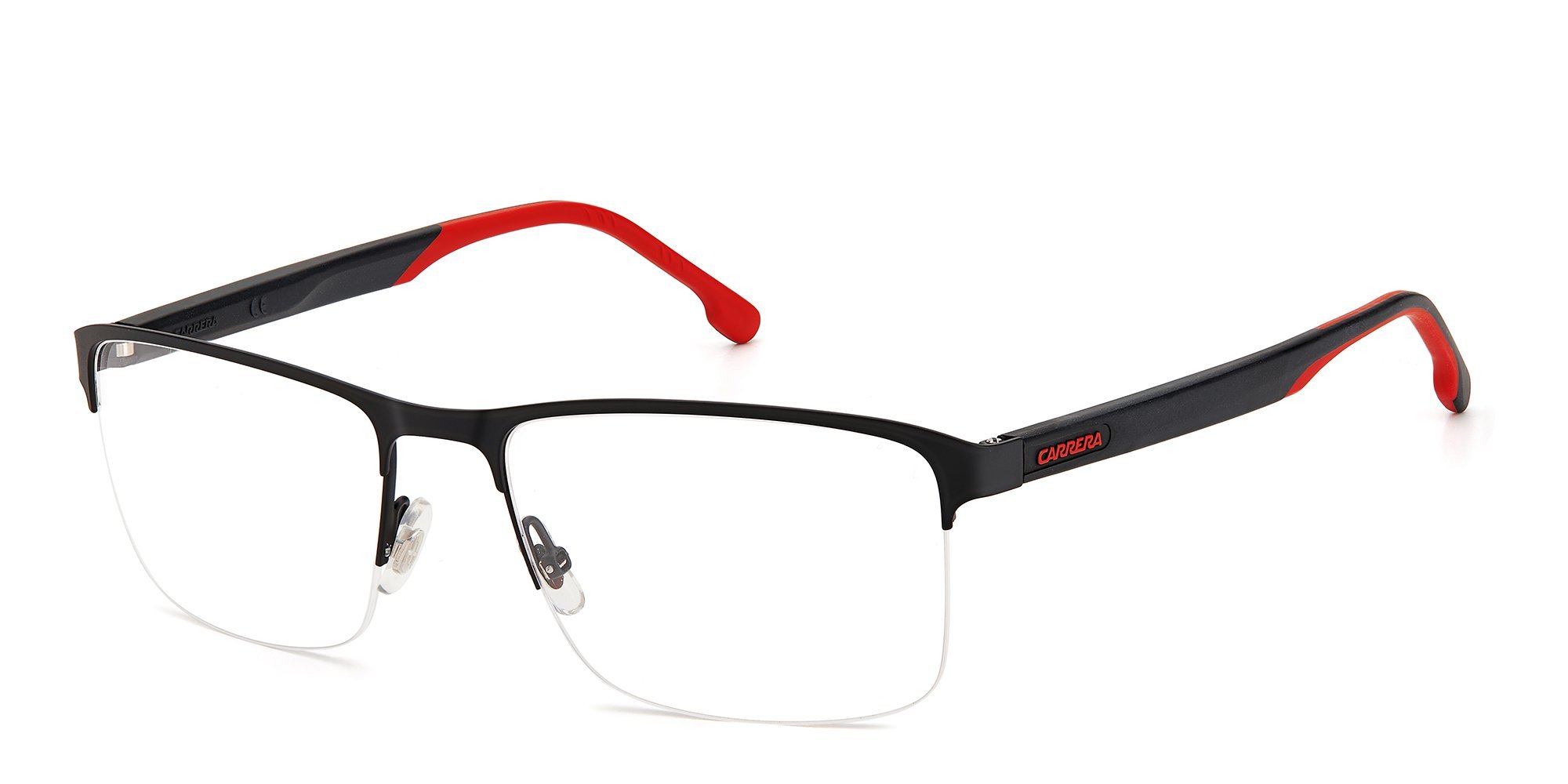Embrace a sporty and stylish look with the Carrera 8870 eyeglasses for men. Crafted with rectangular metal rims, these glasses offer a combination of lightweight comfort and long-lasting durability. The metal rims gracefully rest above the browline, while the plastic temples ensure a comfortable fit behind the ears. The semi-rimless frames provide an unobstructed view of your surroundings, making them advantageous for activities like driving or playing tennis. Elevate your performance with these eyeglasses that blend functionality with a sleek aesthetic