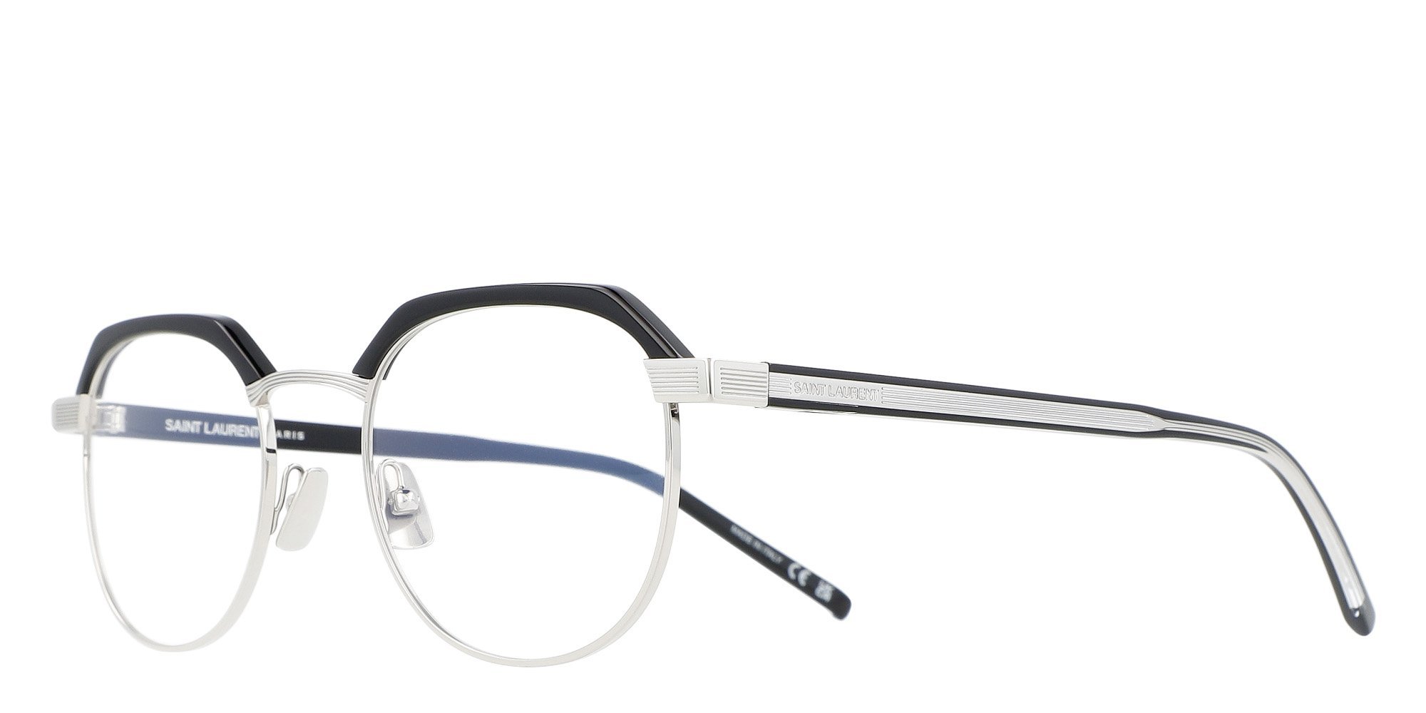 The Saint Laurent SL 124 Optical frames offer a sleek, round design made from lightweight and durable metal. These full-rim glasses provide a sophisticated, minimalist look perfect for any occasion. The Saint Laurent logo on the temples adds a subtle yet luxurious detail to this elegant eyewear.