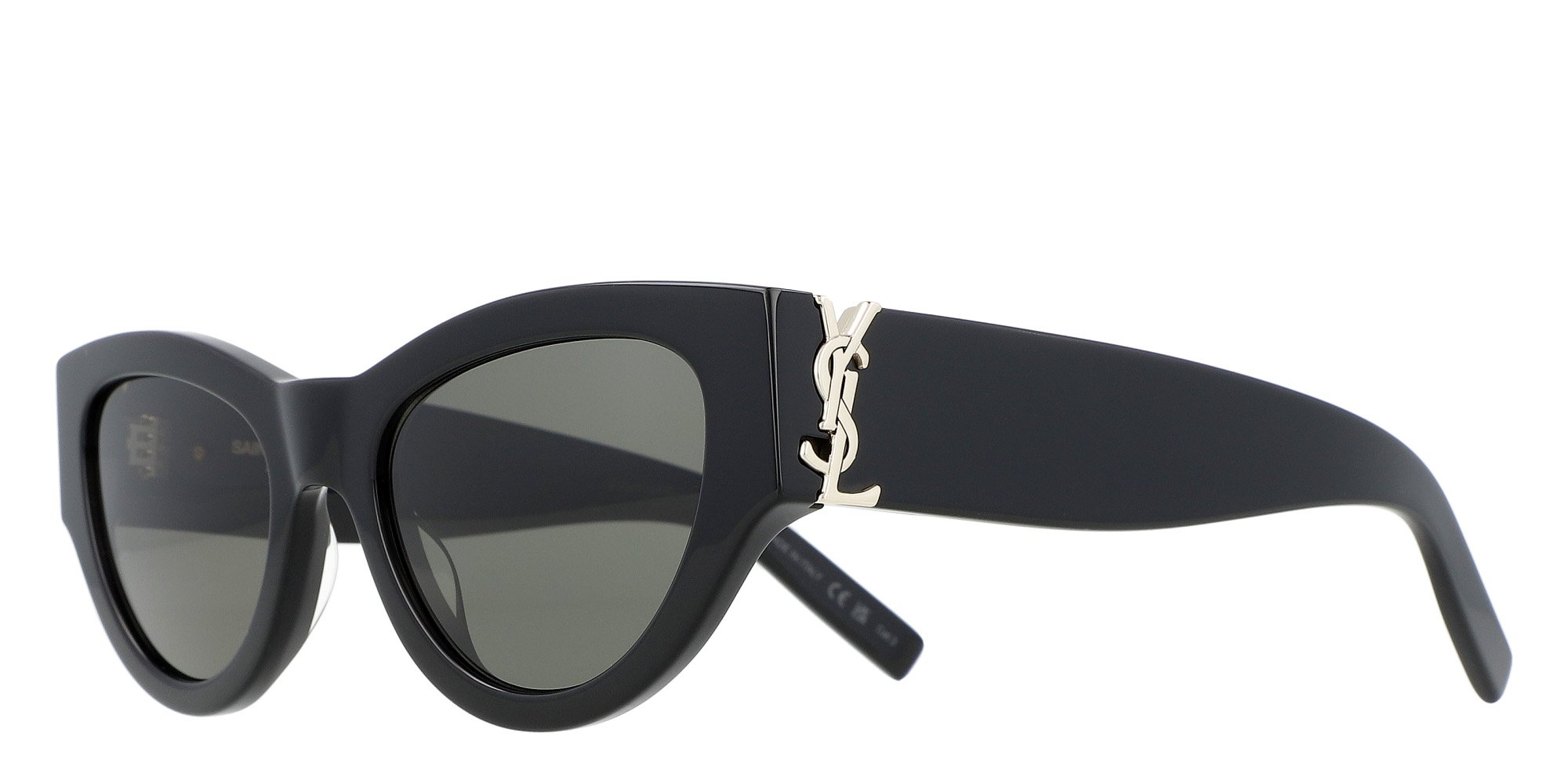 The Saint Laurent SL M94 Cat Eye sunglasses feature a bold full-rim acetate frame with a glamorous cat-eye design. These sunglasses offer complete UV protection and are perfect for adding a touch of sophistication to your look. The Saint Laurent logo on the arms completes this luxurious accessory.