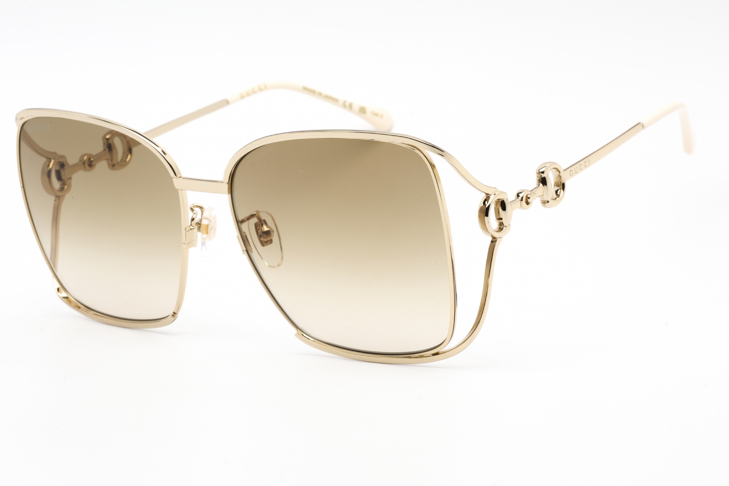 Gucci GG1020S in Gold. This model features an eye catching shape to complement your facial features.The frame is made from quality materials, balancing weight and strength for your ultimate comfort.
