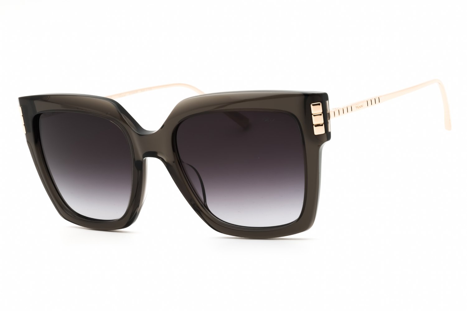 Chopard SCH353M in Shiny Transparent Grey. This model features an eye catching shape to complement your facial features.The frame is made from quality materials, balancing weight and strength for your ultimate comfort.