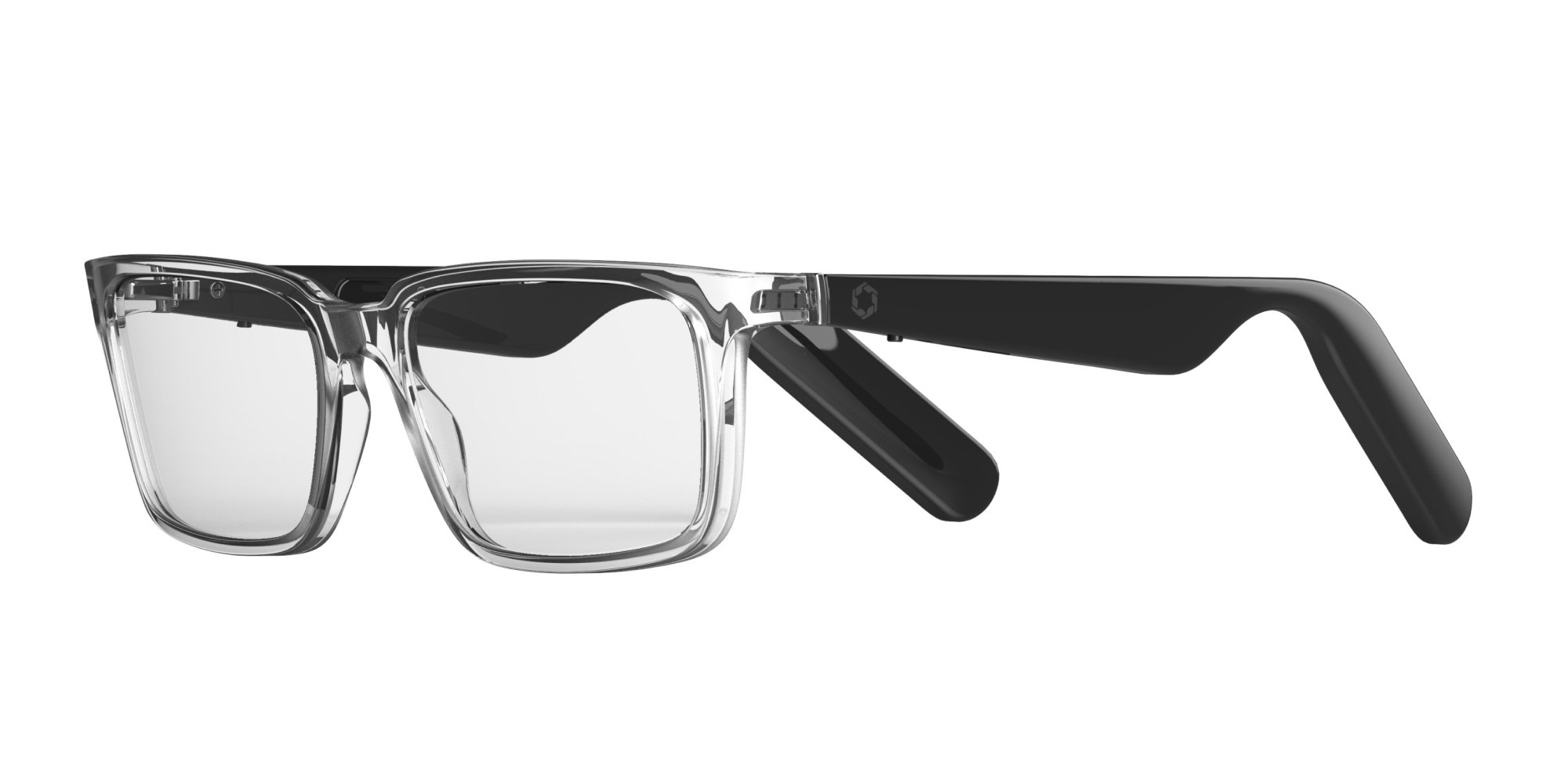 Lucyd Eclipse offers a clean, minimalist aesthetic with a softly rounded rectangular shape. The full-rim plastic frame is lightweight and tailored for everyday wear. Smart functions include touch-activated controls for hands-free calling, music streaming, AI access, and quick voice messaging, making it a practical companion for tech-savvy routines.