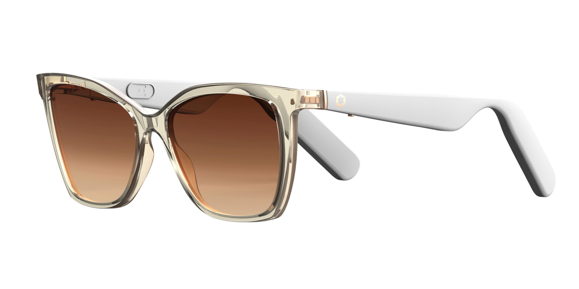 Lucyd Millennia stands out with a chic cat-eye silhouette and a glossy full-rim finish, designed specifically for a feminine fit. The stylish plastic frame blends fashion with function, offering hands-free control of music, calls, voice memos, and AI interaction. A versatile choice for sunny days with built-in smart audio discreetly integrated into the arms.