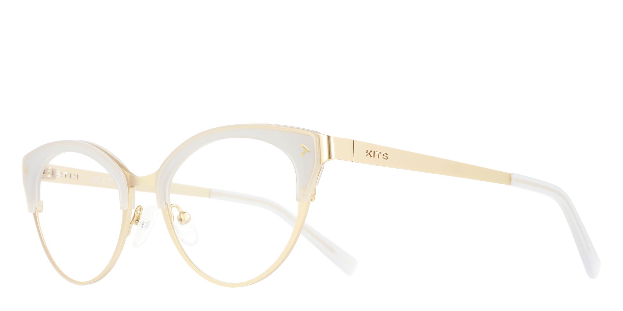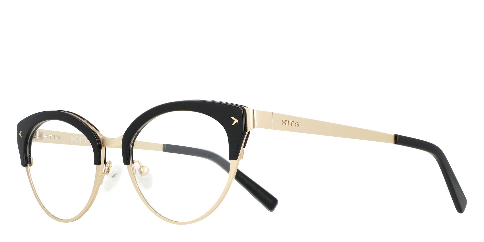 Cat eye hybrid glasses with stainless steel frame and acetate brow pieces.