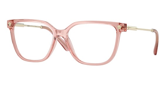 Versace VE3388U in Peach Transparent. This model features an eye catching shape to complement your facial features.The frame is made from quality materials, balancing weight and strength for your ultimate comfort.