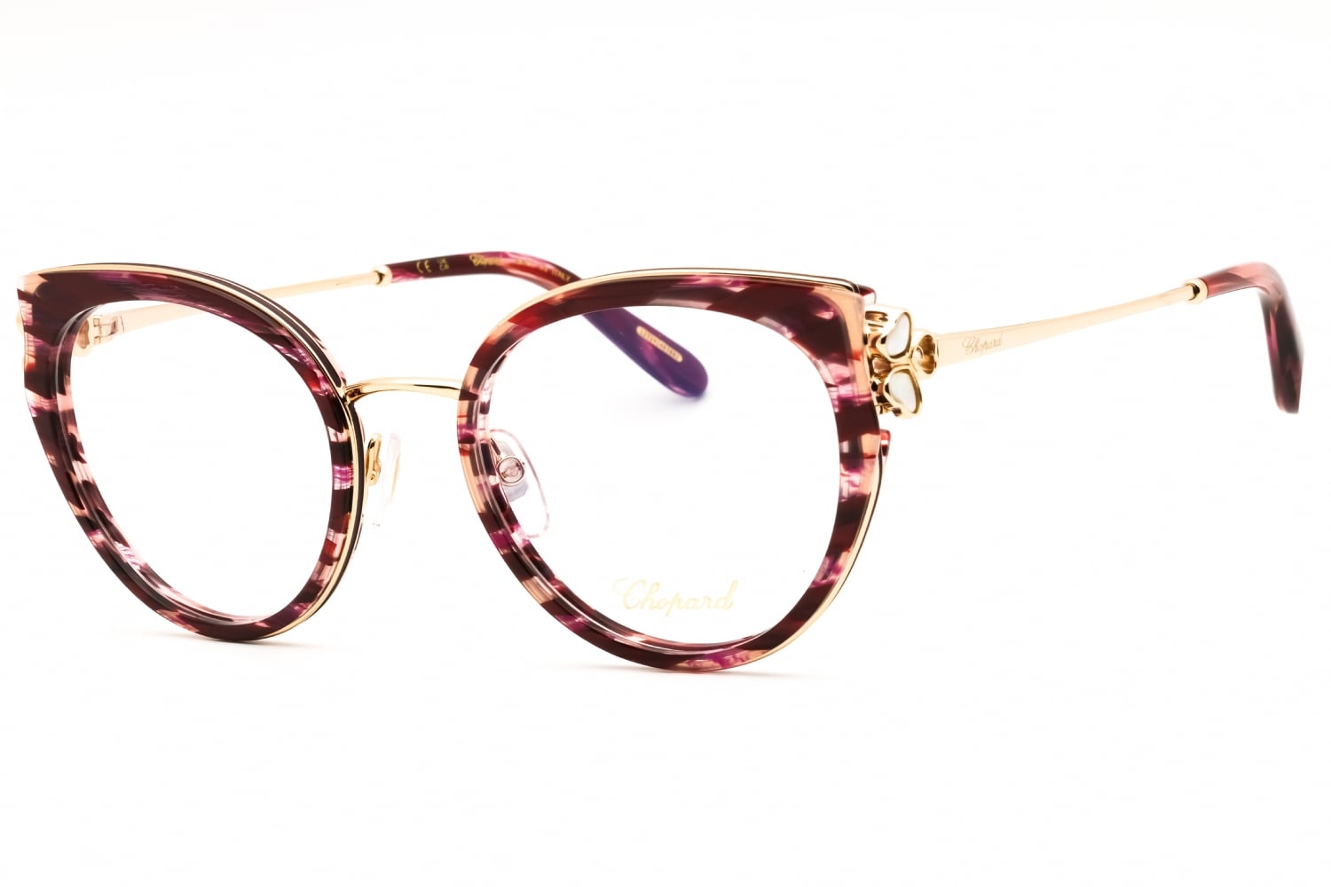 Chopard VCH367V in Shiny Streaked Burgundy. This model features an eye catching shape to complement your facial features.The frame is made from quality materials, balancing weight and strength for your ultimate comfort.